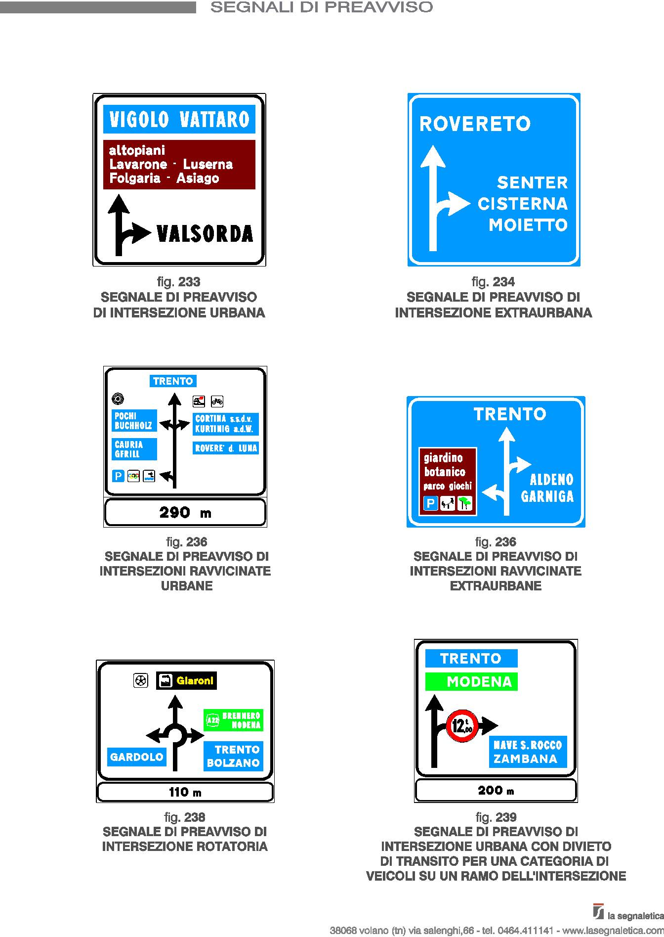I segnali di preavviso contengono lo schema dell'intersezione, realizzato mediante frecce che possono avere spessore differente secondo la geometria e l'importanza delle strade, con i nomi delle località raggiungibili attraverso i vari rami dell'intersezione (Figure II 233, II 234, II 235).